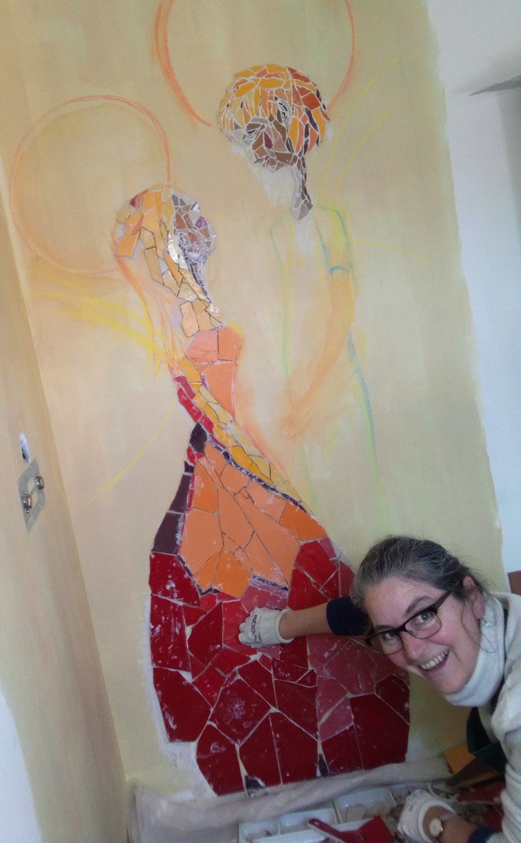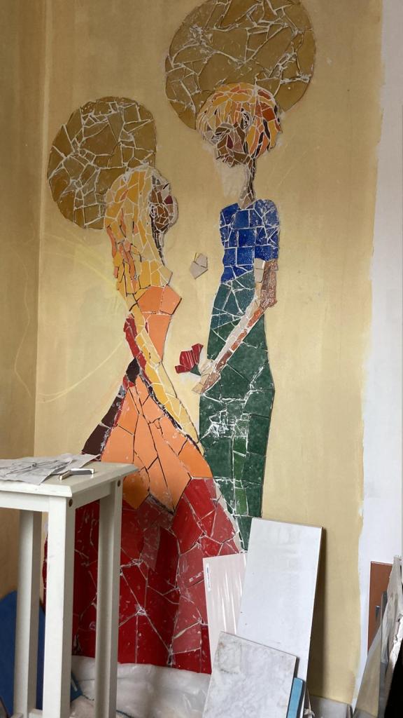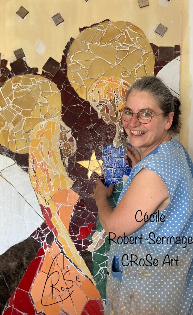 Les auréoles dorées : vaste défi. N’ayant pas trouvé ce que je souhaitais, j’ai créé mes propres mosaïques 🙂